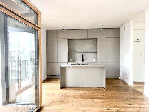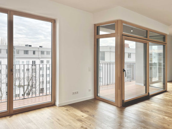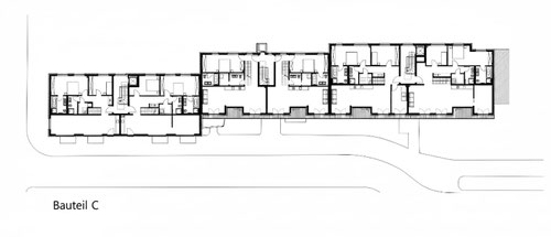 Gestalterisch werden die Dachgeschoßneubauten abgesetzt und sichtbar gemacht. Die Kubatur und die Fenstergestaltung bezieht sich auf die darunter liegenden Gebäude.