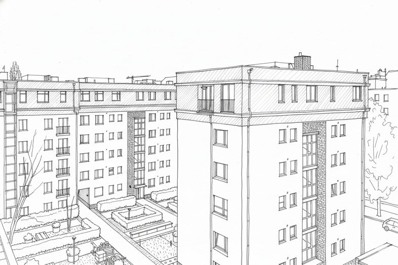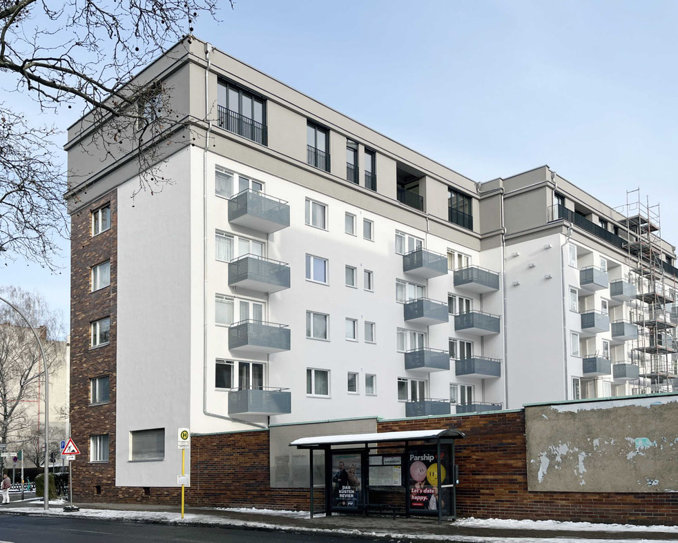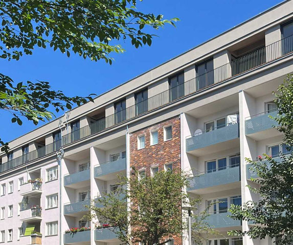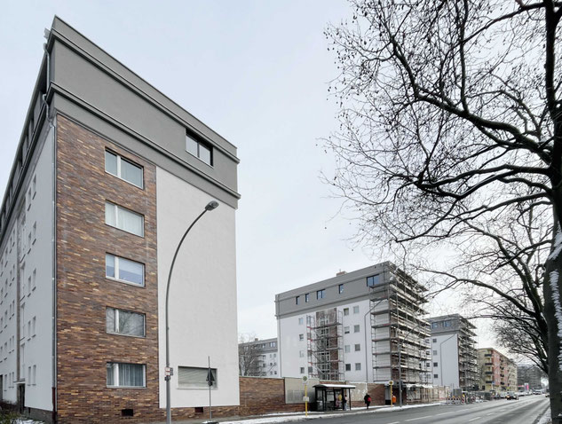 Die Bestandsbauten aus den Aufbauprogrammen werden mit eingeschossigen Dachneubauten versehen. Die Herausforderung besteht in der technischen
