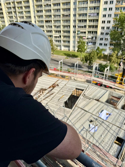 Die Baustelle in Berlin-Wedding ist bereits im 3. Obergschoss angekommen. Die enge Baulücke stellt eine hohe innerstädtische Verichtung dar, die den